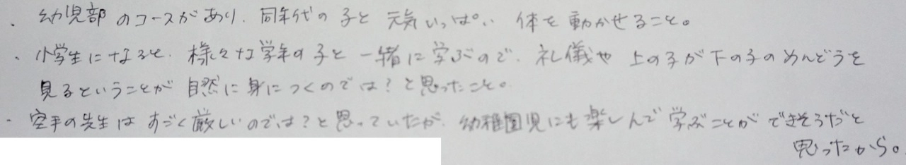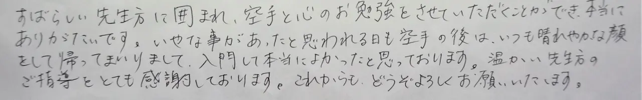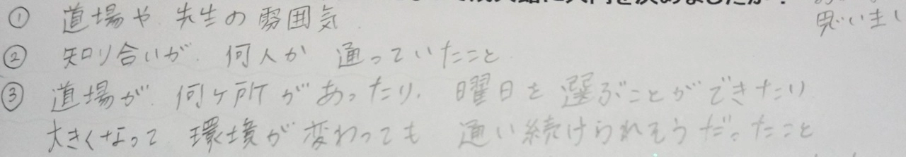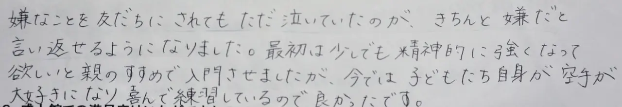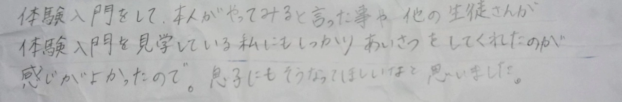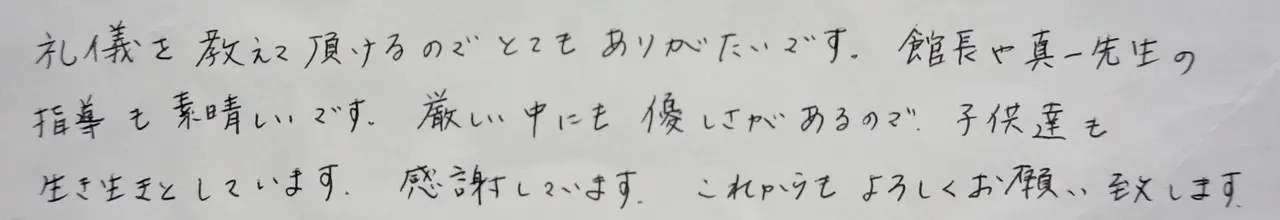 ぼくはけいこであいさつをしていたら、ふだんもいろんな人にあいさつができるようになりました。けいこ以外でもあいさつ、へんじ、くつならべなどができるようになってきてがっこうの先生に「えらいねぇ」と褒めてもらえてうれしかったで […]