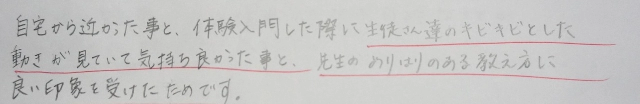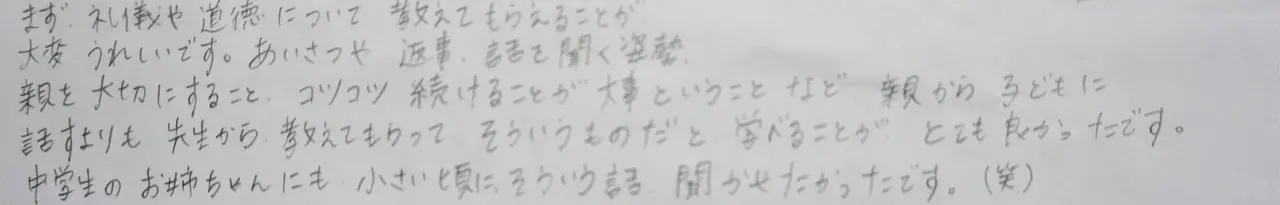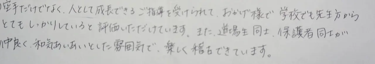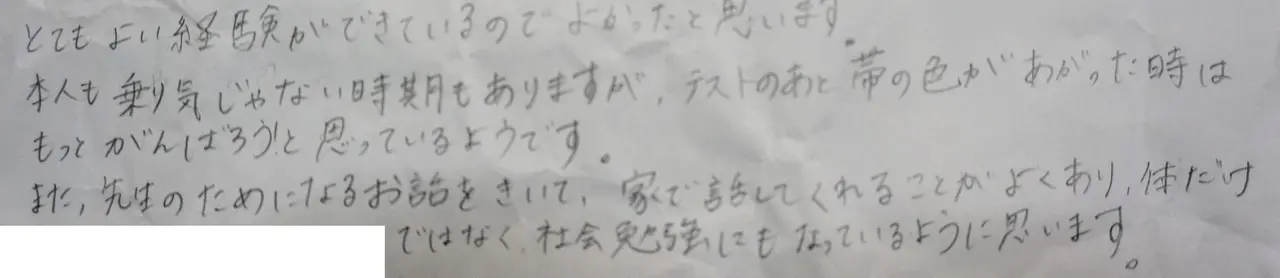 実際に通ってくれている生徒の保護者の方にアンケートをとりました。道場の雰囲気や指導方針を知っていただけます。