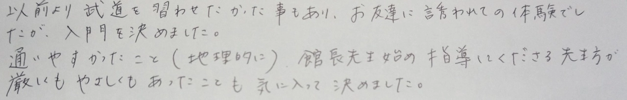 入門前は、学校の授業での発言は少なかったが、積極的に手を挙げ発言回数が増えました。 実際入門していかがでしたか? Q成人館の良いところ 人間教育を道場方針とし、礼儀・感謝について、子供たちに対して熱心に行っていただける。 […]